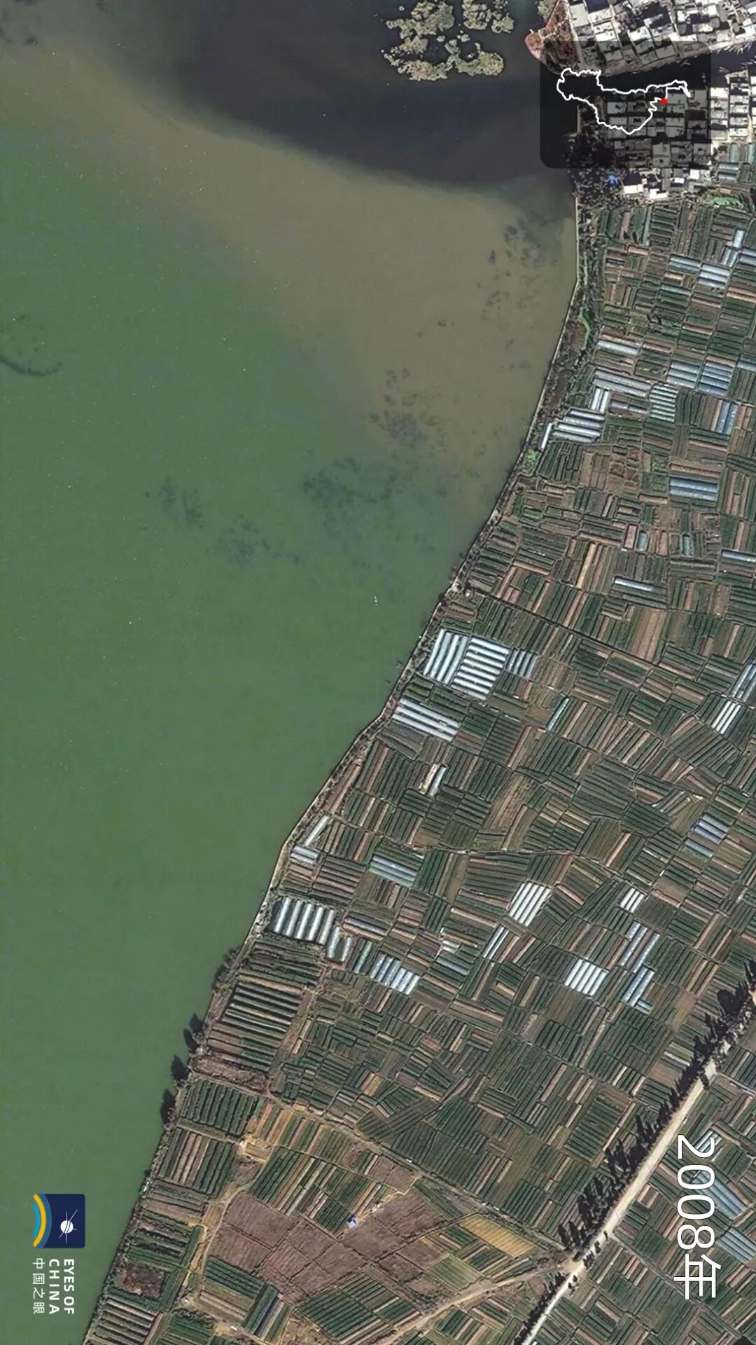 此次习近平总书记到访的星海半岛滨湖生态湿地,位于盘龙江注入滇池的入湖口,规划面积上千亩,4年前开工建设。在环绕滇池的诸多湿地公园中,这个公园不大但却精致,芦苇、菖蒲丛生,栈道蜿蜒,水波清透。这里曾有3个湖边村庄。从2008年和2019年的卫星图对比可见,紧贴湖水的大棚和农田已变为公园绿地。