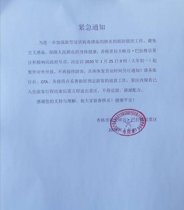 云南网讯(记者 熊强)为进一步加强新型冠状病毒感染的肺炎的联防联控工作,避免交叉感染,保障人民群众身体健康,积极响应政府号召,1月25日,云南香格里拉巴拉格宗景区发布通知称,该景区决定自2020年1月25日(大年初一)起暂停接待游客,具体恢复营业时间另行通知。