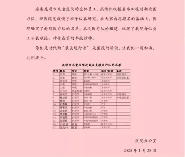 九三学社昆明市委主委、昆明市儿童医院院长张铁松,在1月29日下午“昆明市儿童医院援助湖北医疗队出征前动员仪式暨组建医院疫情防控应急加强队伍仪式”上说:“现在是国家最危难的时候,也是国家最需要我们医务工作者的时候,我们要牢记使命、勇于担当,勇赴防疫第一线!”