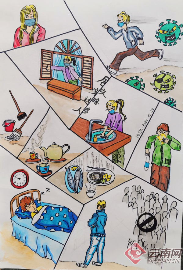 “我校师生学子们还积极创作了书画作品声援‘疫’线,例如,辅导员陈欣老师就创作了一系列宣传画作,用画笔记录这场无声的战‘疫’,为大家加油鼓劲。”云南林职院相关负责人介绍,抗疫期间,学校制定了疫情管控方案,建立了学生辅导员学院学校四级报告制度,引进微信手机端小程序开展“一日一报”动态信息收集,及时掌握学生动态。师生们认真贯彻落实防疫阻击战有关要求,在各自的家乡书写着属于自己的抗疫战歌。