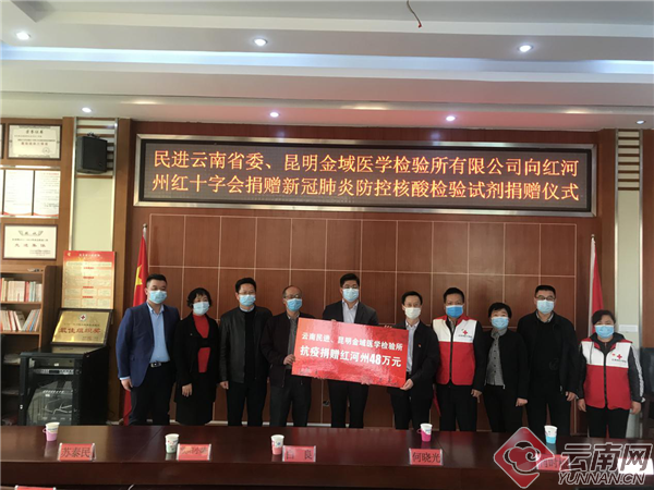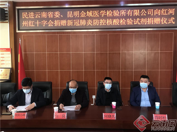 3月11日下午,民进云南省委、昆明金域医学检验有限公司向红河州红十字会捐赠新冠肺炎防控核酸检验服务捐赠仪式在红河哈尼彝族自治州红十字会备灾中心举行。