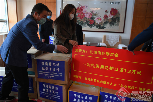 19日,云南新的社会阶层人士“同心抗疫”服务团向云南海外联谊会捐赠1.2万只一次性医用防护口罩,这一箱箱贴有“四海皆兄妹,血浓华夏情”的口罩将由云南海外联谊会统一运往东南亚南亚国家,助力当地侨胞抗击疫情。