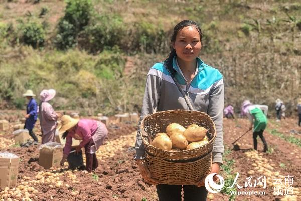 景东县文龙镇下瓦伟村,村民抱着刚挖出来的马铃薯。人民网 薛丹 摄