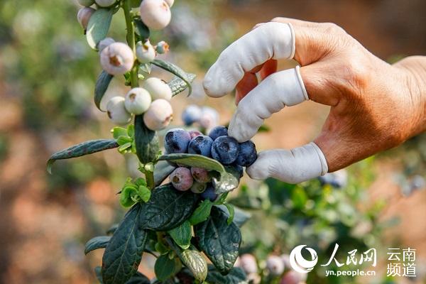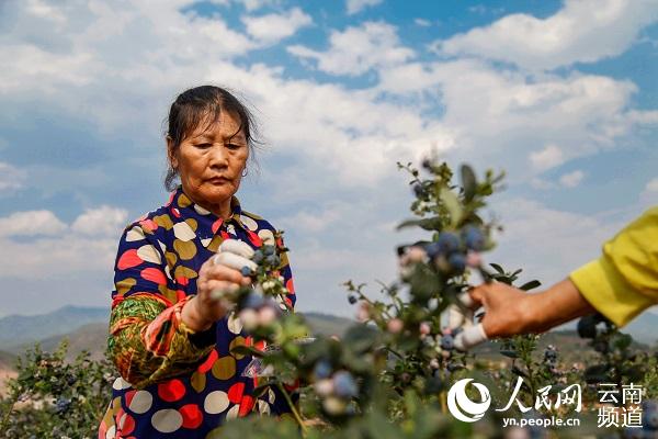 景东县文井镇者吉村的蓝莓种植基地里,工人们正在采收蓝莓。人民网 薛丹 摄