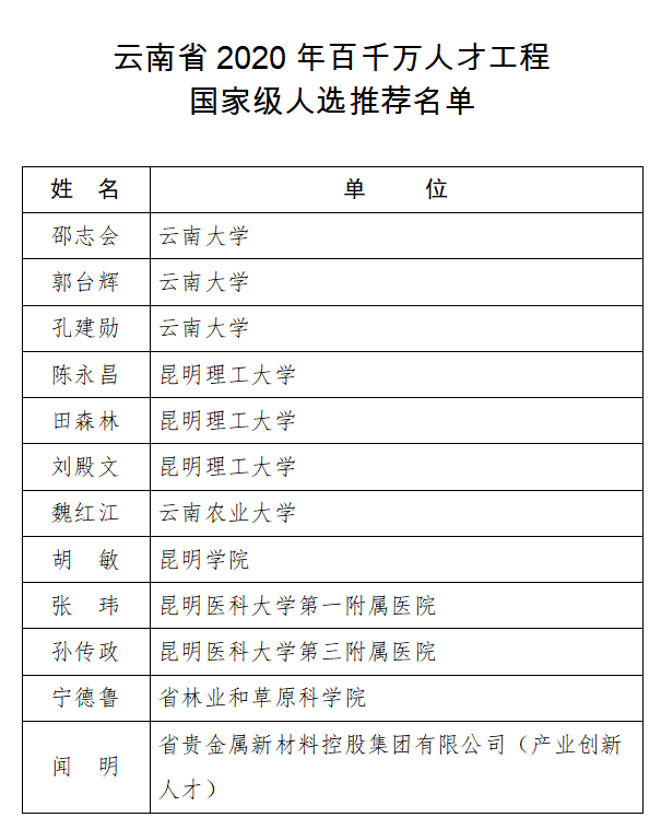 原标题:正在公示!这12人拟推荐为云南省2020年百千万人才工程国家级人选