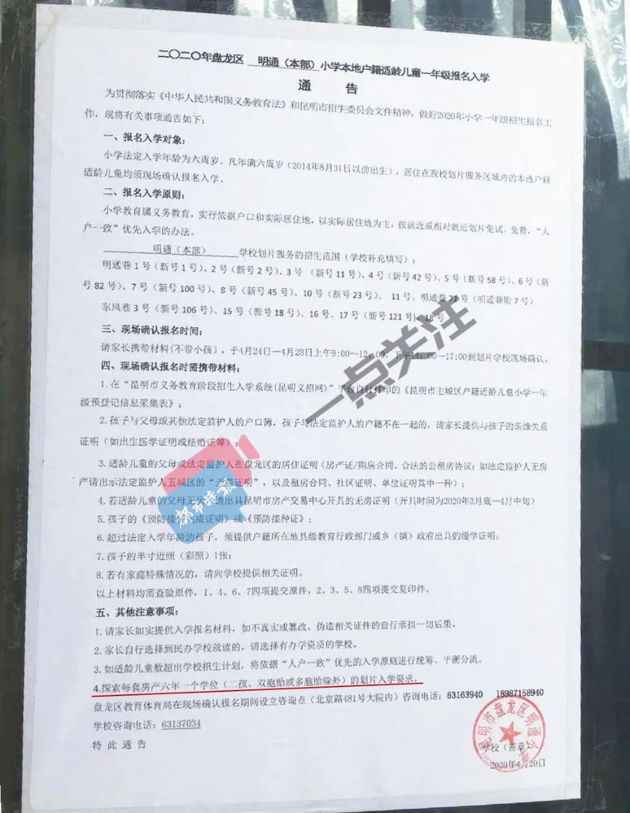 值得注意的是,今年不少学校都探索每套房产六年一个学位的政策(二孩、双胞胎或多胞胎除外)。都市时报一点关注记者在收集信息时注意到,目前昆明有金康园、云波小学、园博小学、明通小学(本部)、盘龙小学人民东路校区、盘龙小学映象校区、联盟小学等小学在入学通告中进行提示。