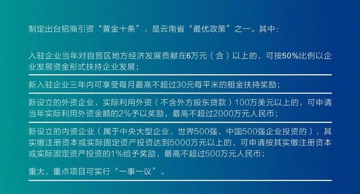 贸试验区昆明片区推出了全省最优的“黄金十条”招商引资政策,其中包括对租金,人才,税收都有着足够吸引人的优惠政策。在营商环境等源头上,营造了良好的发展氛围,将吸引更多企业进行入驻,确保持续生态的“源头活水”。