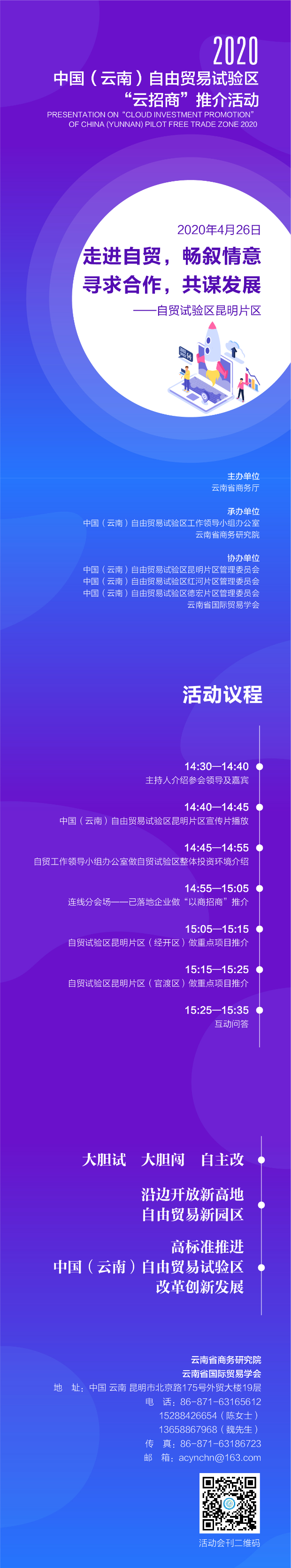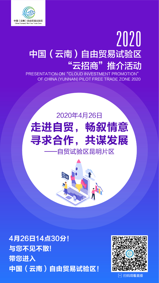 2020年4月26日中国(云南)自由贸易试验区昆明片区“云招商”推介活动在多个平台同时在线直播。活动的举行将为希望到云南投资的企业带来最新的政策讲解和实时问题解答。同时,自贸工作领导小组将对中国(云南)自由贸易试验区的整体投资环境做详细的介绍及自贸区重点项目的推介,还能通过已落地的企业的推介了解到最真实的情况及落地自贸区的感受。