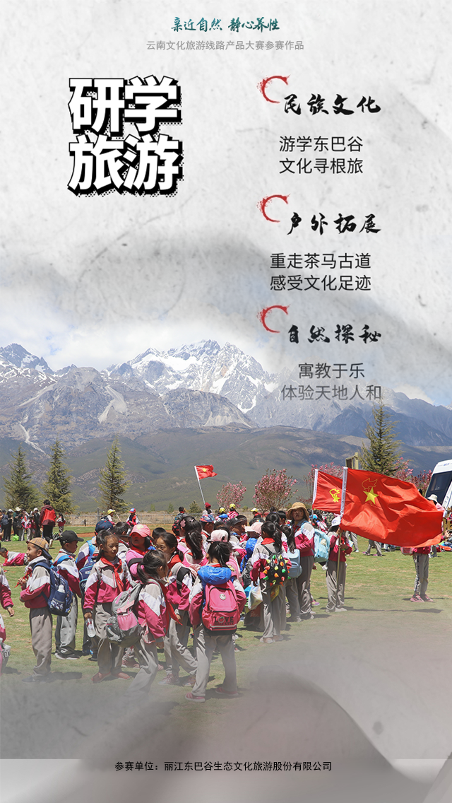 线路位于丽江东巴谷康养小镇内,距离丽江古城15公里,海拔2600M,占地面积2500亩,视野绝佳、交通便捷,属国家AAAA级景区,先后被评为“院士科学家康养基地”、“中国科普联盟科普基地”、“民族民俗文化旅游示范区”等。目前已成为国内知名的集收容建筑文化,展现和传承民族民间歌舞技艺,传承和展示少数民族语言文字,传承和展示举办民族节庆活动和宗教仪式,集中展示少数民族服饰、生产生活器皿用具等为一体的民族文化风情景区。