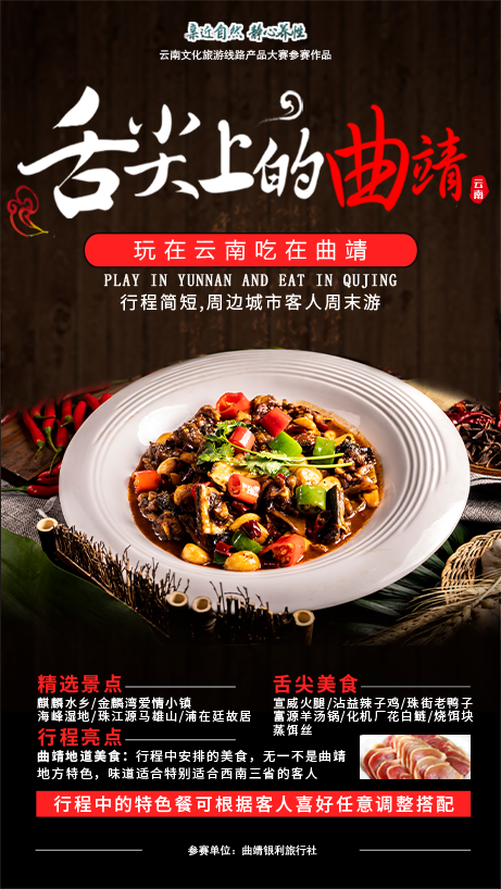 一个人要去一个地方旅游的原因可以有很多,也许是因为一个人,一首歌,一部电影,一个风景,一段故事等等,也许是因为一个美食,一种记忆中的味道。人们都说“玩在云南,吃在曲靖”,曲靖的美食从来都是曲靖的一张名片。早在民国时期,由宣威人浦在廷先生创立的德和罐头公司,就把曲靖宣威的火腿,推向了海内外,宣威火腿的名气在那个时候响誉整个东南亚。曲靖的美食:沾益辣子鸡、宣威杀猪饭、珠街老鸭子、会泽黑山羊、富源汤锅羊肉、罗平三白、陆良米线、沿江蘸水鱼、化机厂花白鲢、黄焖羊肉等等,一道道美食,吸引着八方游客来到曲靖。