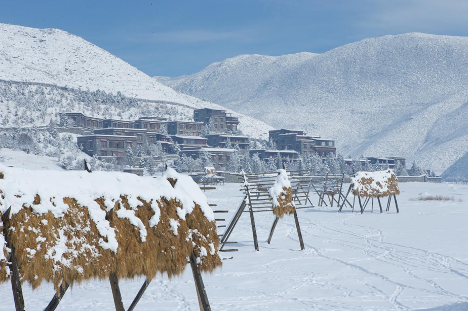 例如松赞的来古山居,地处海拔4200米的西藏昌都市八宿县然乌镇来古村,直面来古冰川,四周环绕雪山。在设计伊始,白玛多吉就决定尽可能少地减少酒店对环境的侵入和破坏,这样的生态理念不仅体现在建造过程中,也要体现在完成的整体视觉效果以及酒店运营里。