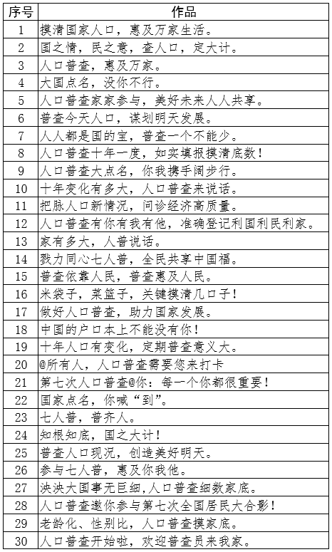 为实现人口普查“家喻户晓,人人支持”,营造良好普查氛围,国务院第七次全国人口普查领导小组办公室于4月8日至22日开展了向全社会公开征集口号标语活动。活动得到社会各界的积极响应,通过在线投稿、公开投票的方式,全国近50万人次积极参与投稿投票,共征集到近1.5万条不重复的口号。经认真筛选、评审,共评选出30条优秀作品。现将优秀作品通告如下: