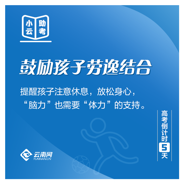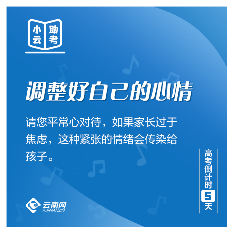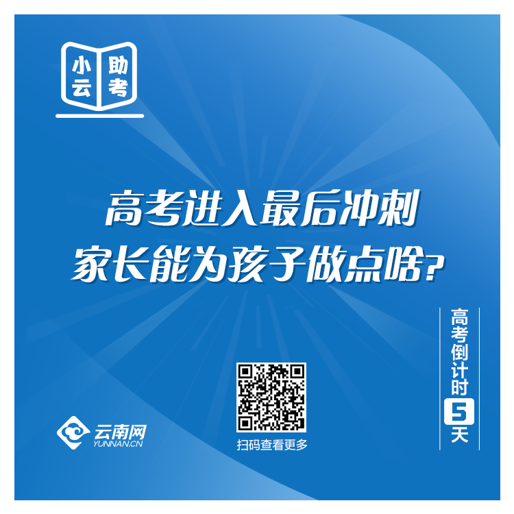今天是7月2日,距离高考还有最后5天。进入最后冲刺阶段,家长们常常会觉得不知道能为孩子做点啥?别着急,云南网小编为家长们整理了以下备忘录,快来分享收藏吧。