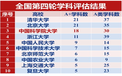 ✦ 2017年12月28日,在全国第四轮学科评估中,中国科学院大学(简称国科大)共有30个学科被评为优秀(A类),其中18个学科被评为A+。