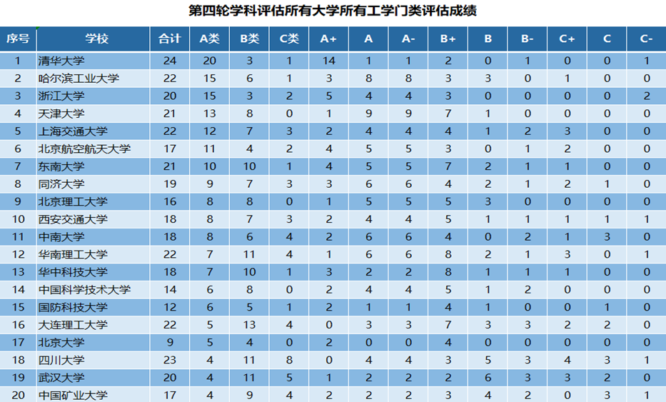✦ 在全国第四轮学科评估中,哈工大共有17个学科位列A类,学科优秀率(A类学科占授权学科的比例)位列全国第六位,A类学科数量位列全国第八位,工科A类数量位列全国第二位。