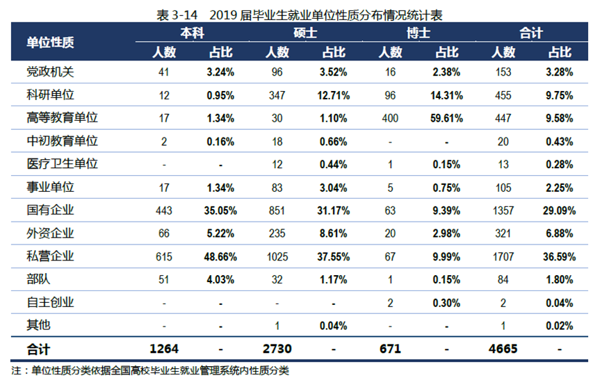 A:2019届本科毕业生3729人,其中就业1264人,国内读研1813人,出国(境)留学478人。读研(国内、外)占比61.44%。