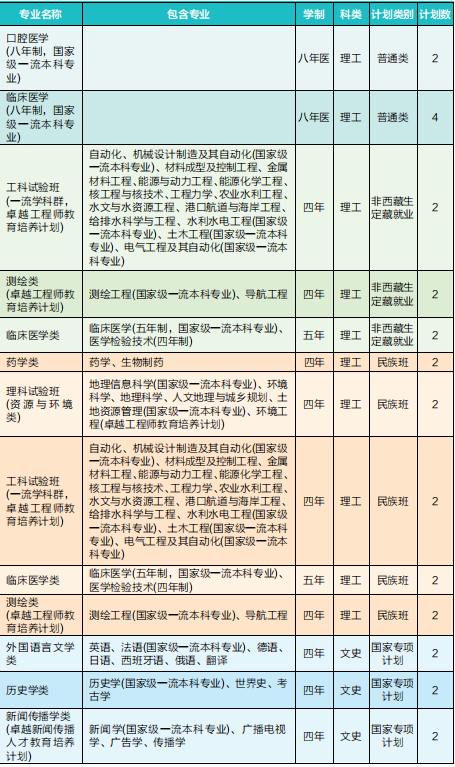 A:我校2020年在云南普通类招收文史类和理工类,还有民族班、国家专项计划和自强计划,新增了强基计划、非西藏生定藏就业计划。“强基计划”考生还须参加我校组织的测试。