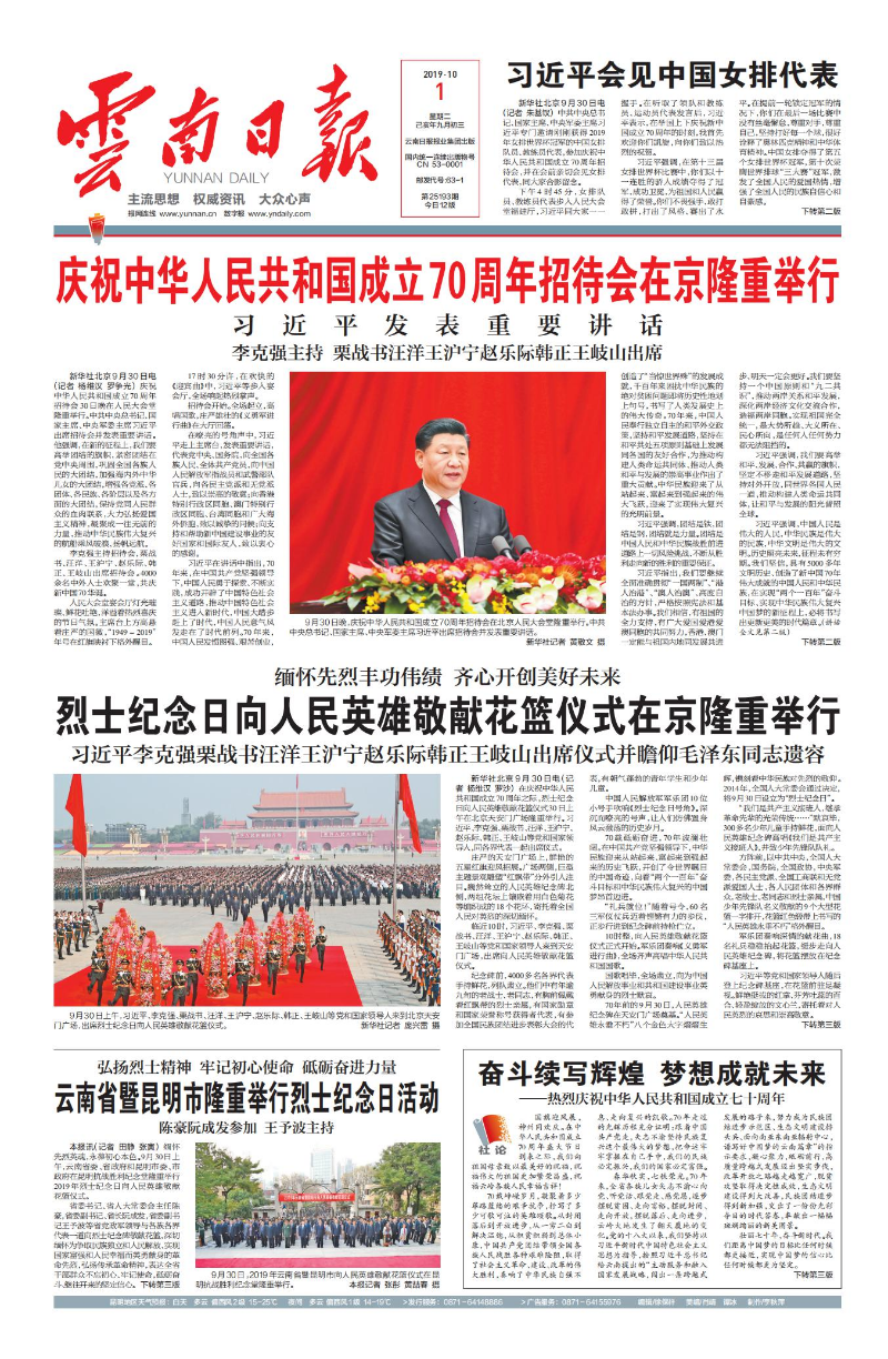 《云南日报》在重点版面和理论言论版面开设“深入学习贯彻习近平新时代中国特色社会主义思想”等专栏,编发一系列学习阐释习近平新时代中国特色社会主义思想的评论理论文章;浓墨重彩、集中深入开展庆祝中华人民共和国成立70周年大型主题宣传,对全省16个州市进行了全媒体全覆盖宣传报道,推出“70年变迁·看边城”“壮丽70年·奋斗新时代——记者再走长征路”等专题专栏,集中展示70年来云岭大地的巨变;聚焦贯彻落实党的十九大各项重大决策部署,持续推进各项重大报道,突出特色、融合创新,做好重大主题宣传;聚焦民族团结进步示范区、生态文明建设排头兵、面向南亚东南亚辐射中心建设以及打赢脱贫攻坚战、“五网”基础设施建设、九大高原湖泊治理等重点工作,加强选题策划,倾力打造“在习近平新时代中国特色社会主义思想指引下——新时代新气象新篇章”“不忘初心 牢记使命”“脱贫攻坚进行时”“建设美丽云南”等近20个专栏,及时、系统反映全省经济社会、各行各业取得的突出成绩和亮点经验。