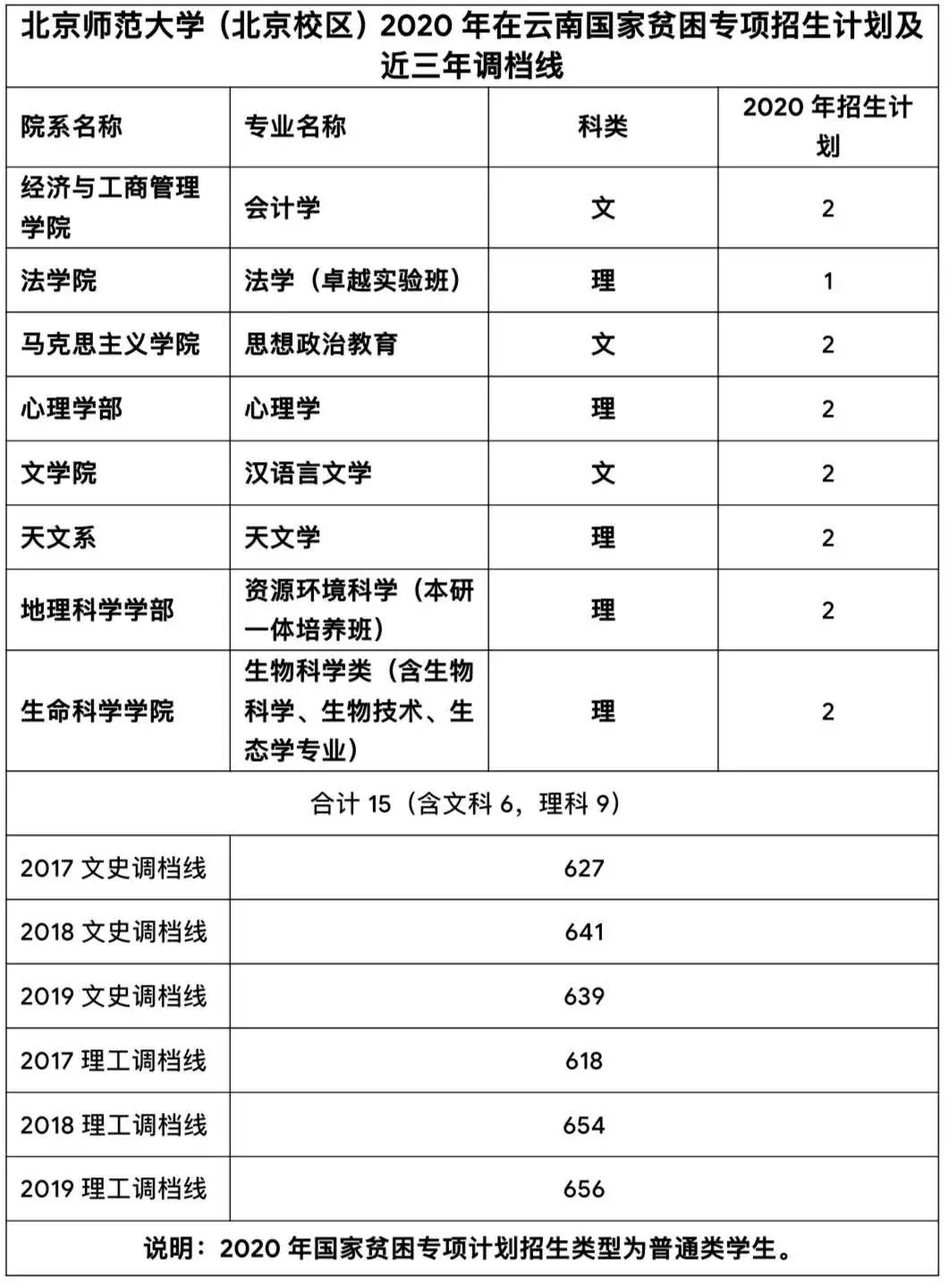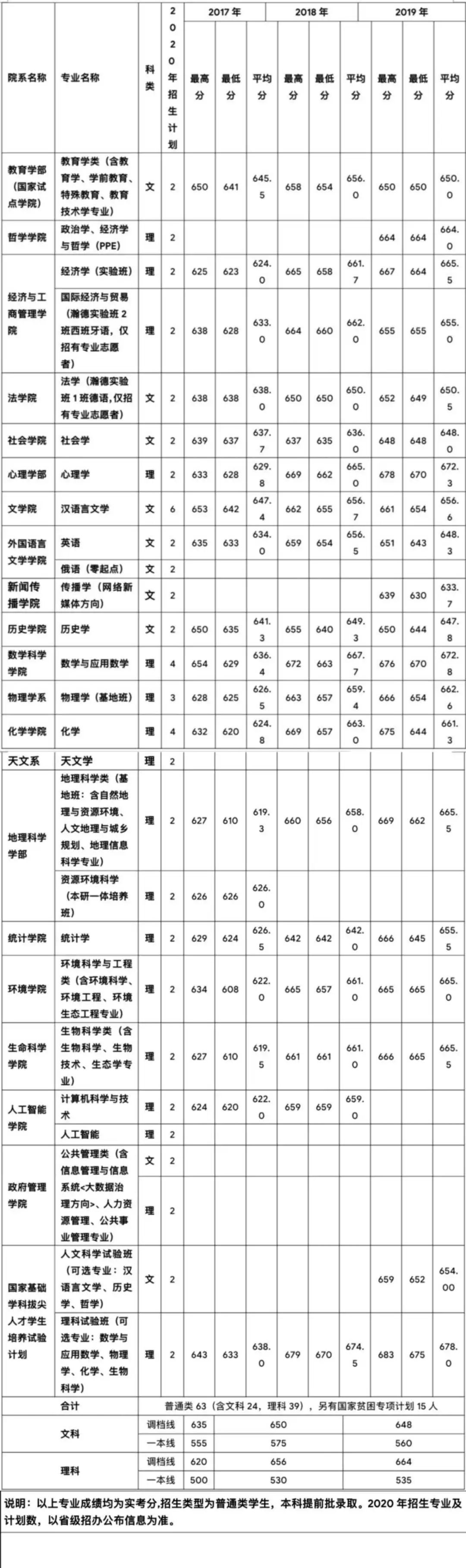 2020年北师大(北京校区)普通类在云南本科招生计划及近三年各专业录取分数线