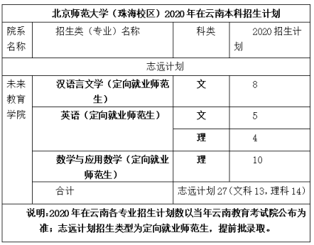 2019年4月,北京师范大学珠海校区正式获批并于同年开始招生,招生代码为:19027。珠海校区是北师大打造的与北京校区同一水平同一标准的南方校区。所有毕业生在规定的年限内达到所在专业毕业要求者,颁发北京师范大学本科毕业证书,毕业证书注明培养校区;符合北京师范大学学位授予有关规定者,颁发普通高等教育本科毕业生学士学位证书。2020年北师大珠海校区首设“志远计划”,面向包括云南在内的7个尚未摘帽的52个国家级贫困县所在省份招收本科定向就业师范生(详见《北京师范大学2020年志远计划招生简章》)。考生可在提前批次的单独投档单位报考,具体以当地考试院通知为准。
