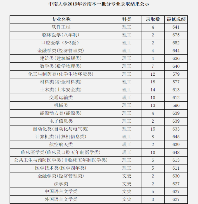 2019年中南大学云南分专业录取情况