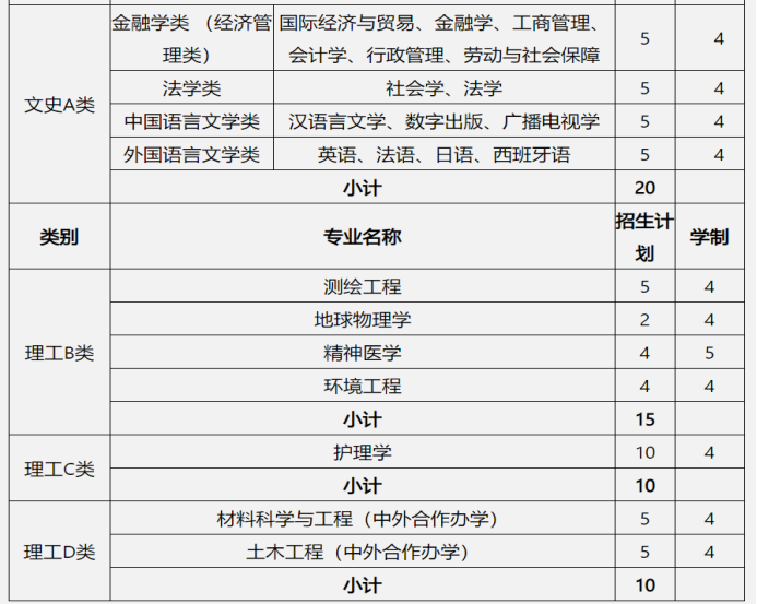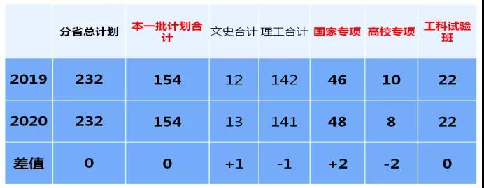 A:中南大学2020年在云南省招生计划为232名,具体包括本一批154名(其中理工医141名,文史13名)、国家专项48名、高校专项8名、工科试验班22人。数据比较见下图: