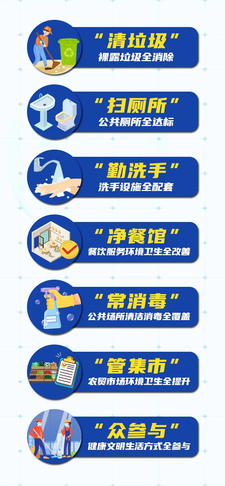 云南省人民政府办公厅印发了《云南省推进爱国卫生“7个专项行动”方案》,提出利用今年7月到明年底一年半的时间,在全省开展以“清垃圾、扫厕所、勤洗手、净餐馆、常消毒、管集市、众参与”为主题的“七个专项行动”