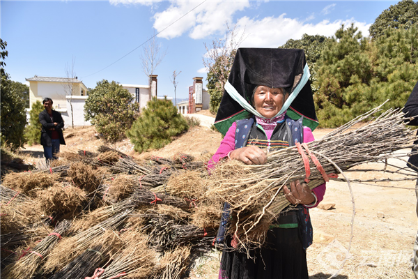宁蒗县西川乡沙力村民罗补落在领取免费的花椒苗。赵庆祖 摄