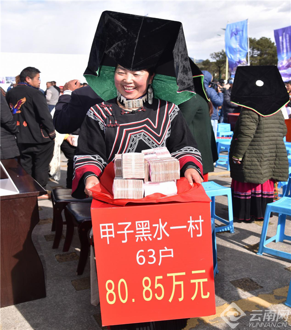 玉龙县玉龙山办事处甲子村委会村民兴高采烈地领取分红。赵庆祖 摄