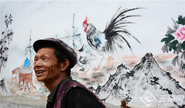 63岁的丽江市玉龙县建档立卡户和树珍在家门口的壁画前。赵庆祖 摄