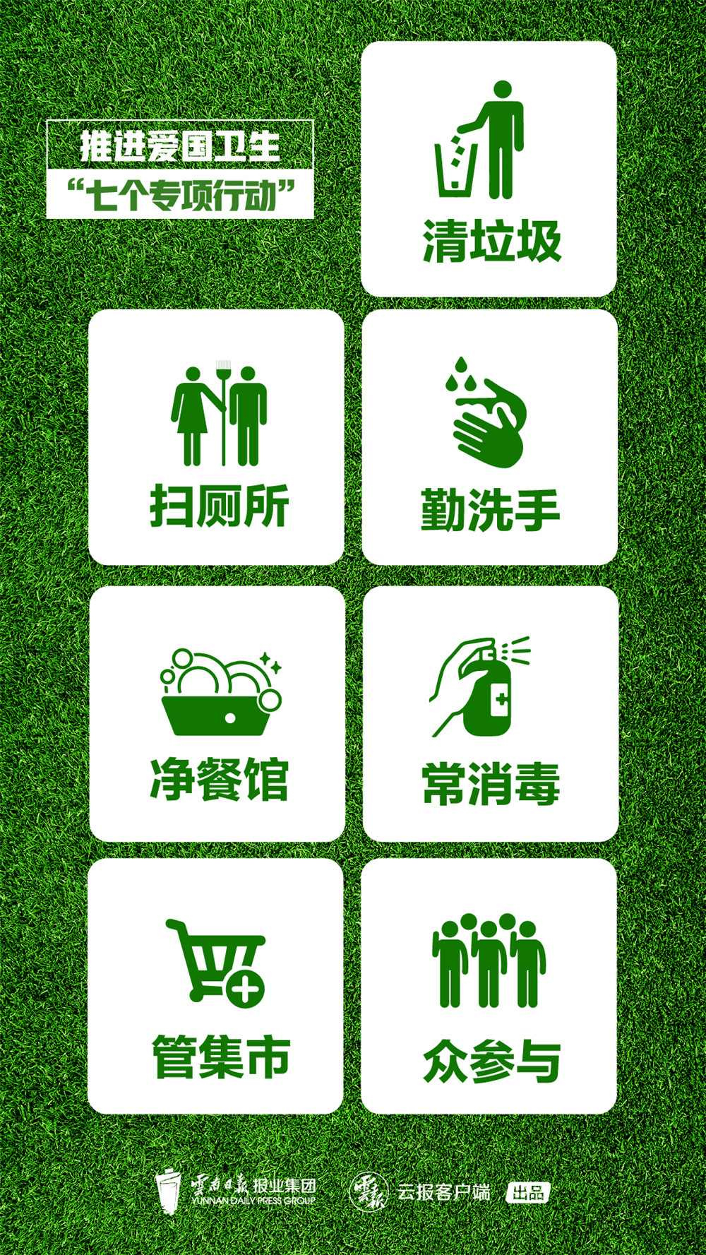 7月30日,云南省人民政府办公厅印发了《云南省推进爱国卫生“7个专项行动”方案》,提出集中开展为期一年半的“清垃圾、扫厕所、勤洗手、净餐馆、常消毒、管集市、众参与”爱国卫生“7个专项行动”。