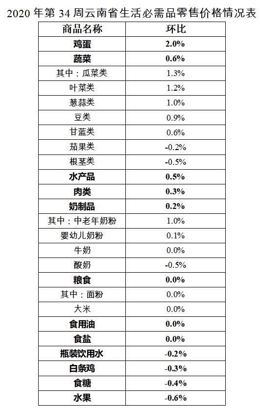 据云南省商务厅生活必需品监测平台数据显示,上周(2020年8月17日—23日)全省生活必需品市场供需平稳,所监测的12大类商品环比呈“5涨3平4跌”态势运行。其中鸡蛋、蔬菜、水产品、肉类、奶制品平均零售价格上涨;粮食、食用油、食盐平均零售价格持平;瓶装饮用水、白条鸡、食糖、水果平均零售价格下跌。具体运行情况如下: