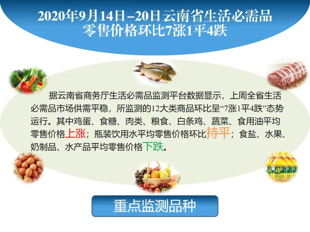 原标题:市场监测丨2020年9月14日-20日云南省生活必需品零售价格环比7涨1平4跌