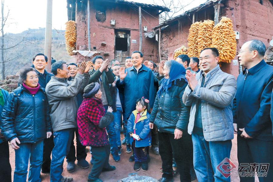 2017年春节前夕,中共中央政治局常委、国务院总理李克强在昭通、昆明考察,代表党中央、国务院和习近平总书记向各族人民送上新春祝福。图为李克强1月23日在昭阳区洒渔镇联合村余家大冲自然村13村民小组看望贫困群众。 记者 雷桐苏 摄