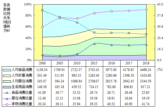2000年以来,吉林居民食品消费比(恩格尔定律关系)持续极显著下降,18年降低14.18个百分点;其与物质消费比之间历年变动相关系数0.9343,亦即93.43%程度同步;物质消费比持续极显著下降,18年降低12.97个百分点。食品消费比重(恩格尔系数)持续极显著下降,18年降低15.46个百分点;居住消费比重前14年极显著上升,近4年略微下降,18年升高6.71个百分点;二者历年变动相关系数-0.8825,亦即88.25%程度逆反,后者升高“进占”比重一定程度填补前者降低“退让”比重,否则非物消费比重提升之“消费结构升级”更加显著。