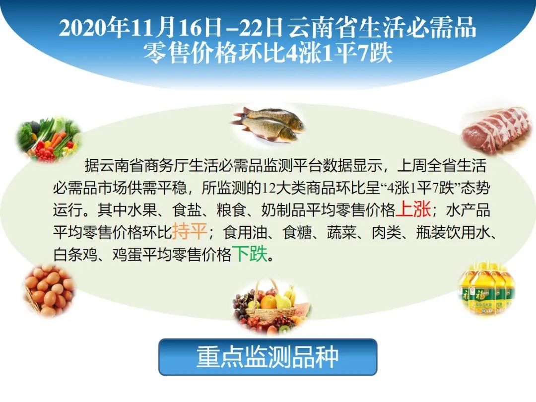 原标题:市场监测丨2020年11月16日-22日云南省生活必需品零售价格环比4涨1平7跌