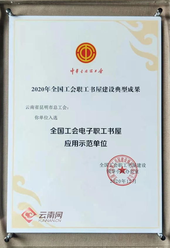 12月8日,在厦门举办的2020年全国工会职工书屋建设成果展示交流活动上,昆明市总工会被中华全国总工会评为“全国工会电子职工书屋应用示范单位”,成为云南省唯一获奖的市级工会组织。此外,昆明市总工会宣教网络部部长杨祎被评为全国工会职工书屋“突出贡献工作者”。