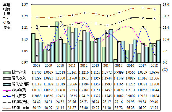2000~2018年甘肃增长相关系数:非物消费与产值之间-0.20,相关性逆反;与居民收入之间0.06,相关性甚微;与居民积蓄之间-0.51,扩大回溯20年间1999~2018年-0.52,2013~2017年-0.82,负相关性显著,二者曲线呈峰谷对应水中倒影。非物消费比(占收入比)前16年极显著上升,近2年较明显下降,18年升高5.56个百分点;非物消费比重(占总消费比)前17年极显著上升,近1年明显下降,18年升高5.94个百分点。非物消费城乡比前2年明显扩大,后16年极显著缩小,18年缩减54.57%;地区差前10年略微扩大,后8年较明显缩小,18年缩减8.92%。这些动态体现由衣食温饱“基本小康”到相对富余“全面小康”的“人民美好生活需要”变化。