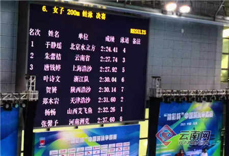 云南网讯(记者 娄莹)2020年12月31日至2021年1月3日,“体彩杯”中国游泳争霸赛在河北奥体中心游泳馆举行,云南省游泳小将朱蕾桔以2分27秒74的优异成绩荣获女子200米蛙泳第二名。