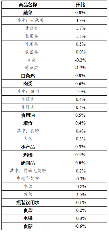 蔬菜零售价格环比小幅上涨。据180家超市、农贸市场30个菜品的监测数据显示,上周全省蔬菜平均零售价格为7.2元/公斤,环比上涨0.8%。