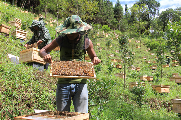 在“脱委会”的帮助下,全县涌现出了很多致富典型。勐梭镇班母村十四组的二妹,到政府引进的中华蜂养殖基地务工,不仅有了稳定的收入,还成为了技术能手。如今二妹承包200箱蜂,有了自己的蜂场,成了村里的致富带头人。