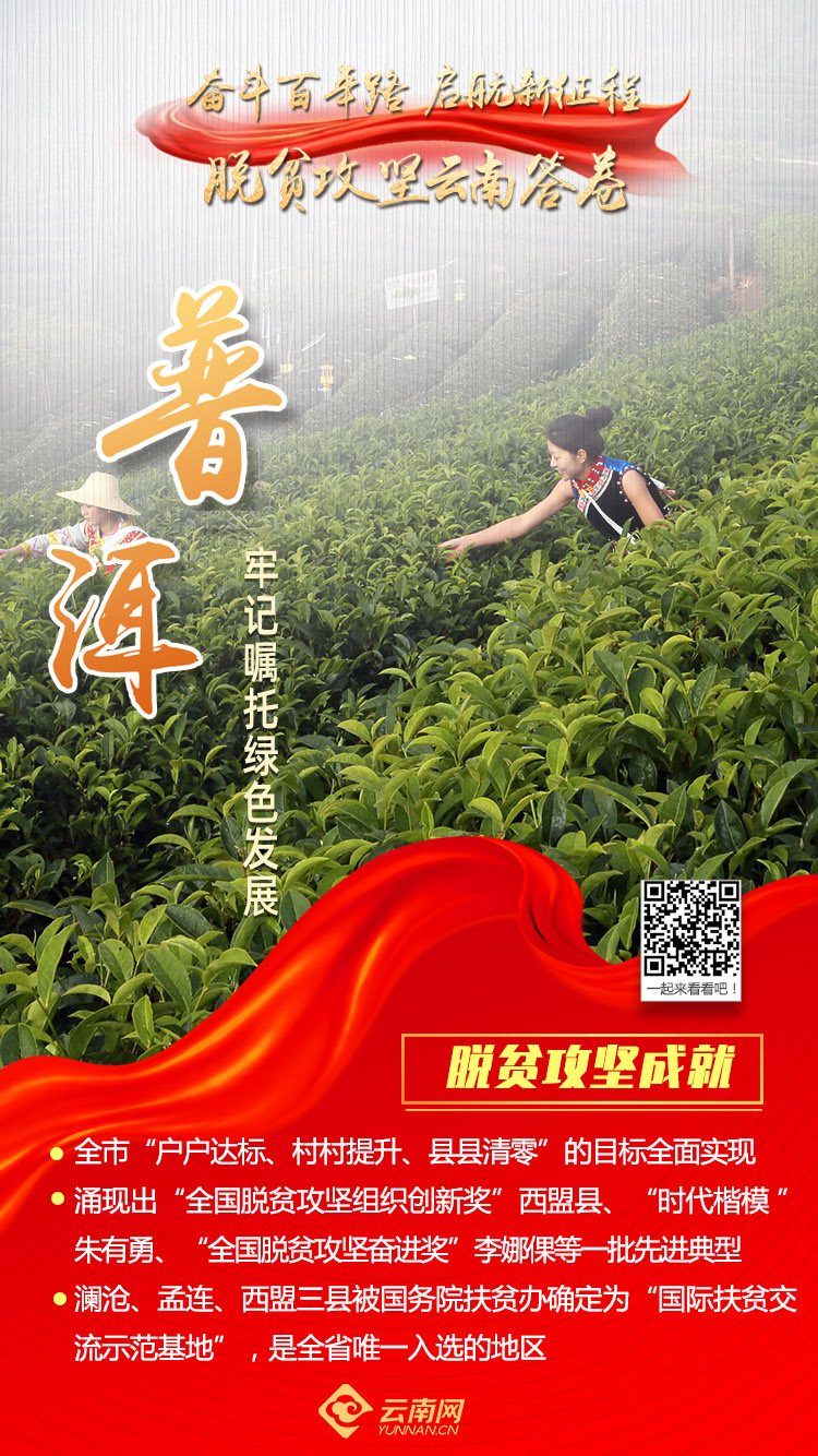 从十县九贫到全面小康,普洱市坚持以脱贫攻坚统揽经济社会发展全局,举全市之力打好脱贫攻坚战,决不让一个少数民族掉队,走出了一条物质脱贫与精神脱贫齐头并进、绿水青山与金山银山交相辉映,民族团结进步与边疆繁荣稳定相得益彰的脱贫新路。