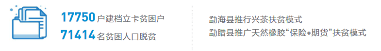 针对因气象灾害和市场价格波动造成胶价持续低迷,部分农户割胶积极性不高,甚至弃割、弃管返贫的现象,勐腊县政府通过与结对帮扶的上海市松江区政府对接,借鉴其他地区“保险+期货”的成功经验,在勐腊县推广天然橡胶“保险+期货”扶贫试点项目。通过建立期货保险机制,无论价格涨跌农户都能保障收入,给贫困胶农吃了一颗“定心丸”。通过“保险+期货”的金融扶贫模式,勐腊县通过发展橡胶这个绿色支柱产业,于2019年3月顺利退出了贫困县行列。