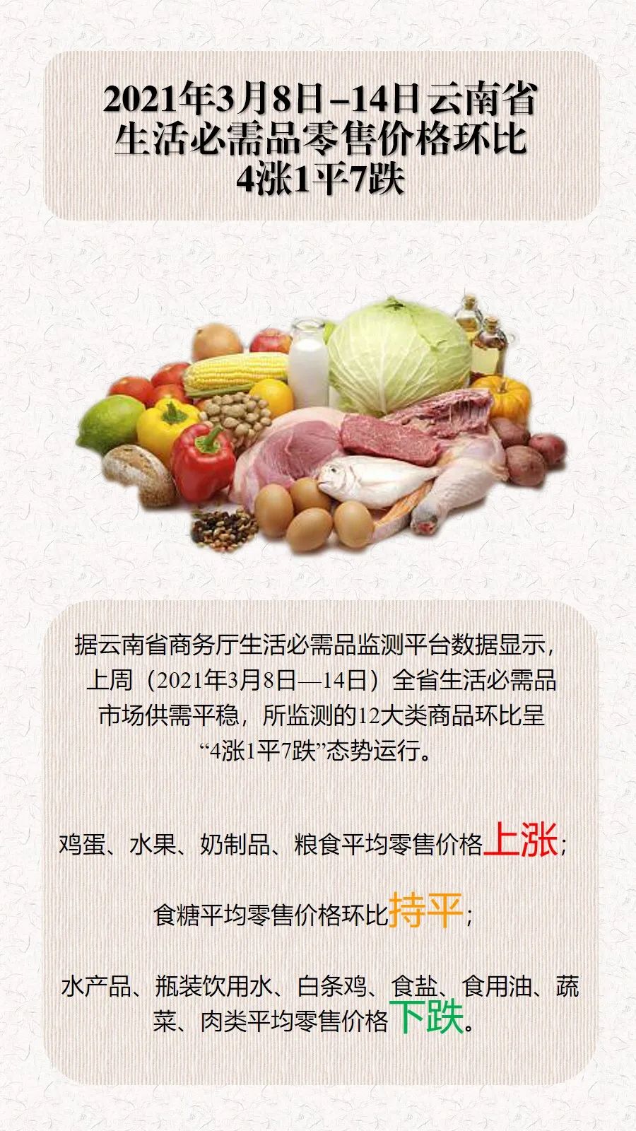 市场监测 | 2021年3月8日-14日云南省生活必需品零售价格环比4涨1平7跌
