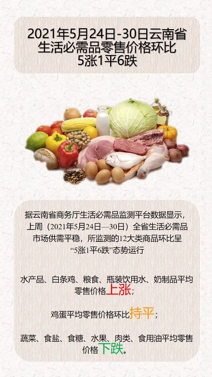 原标题:市场监测|2021年5月24日-30日云南省生活必需品零售价格环比5涨1平6跌