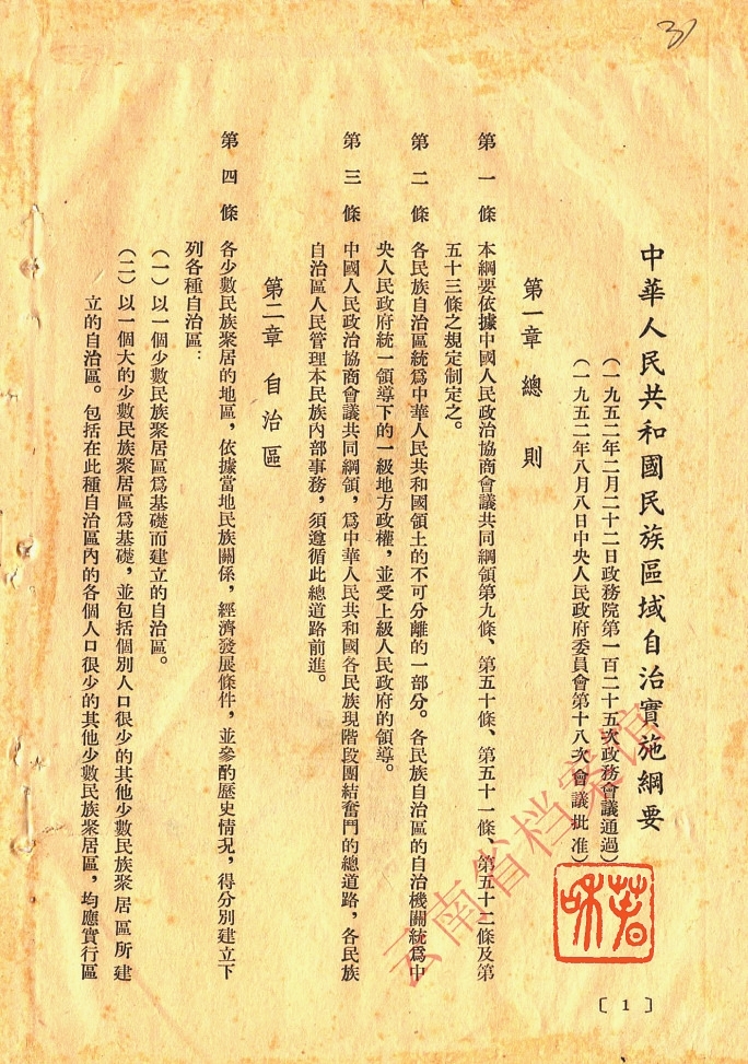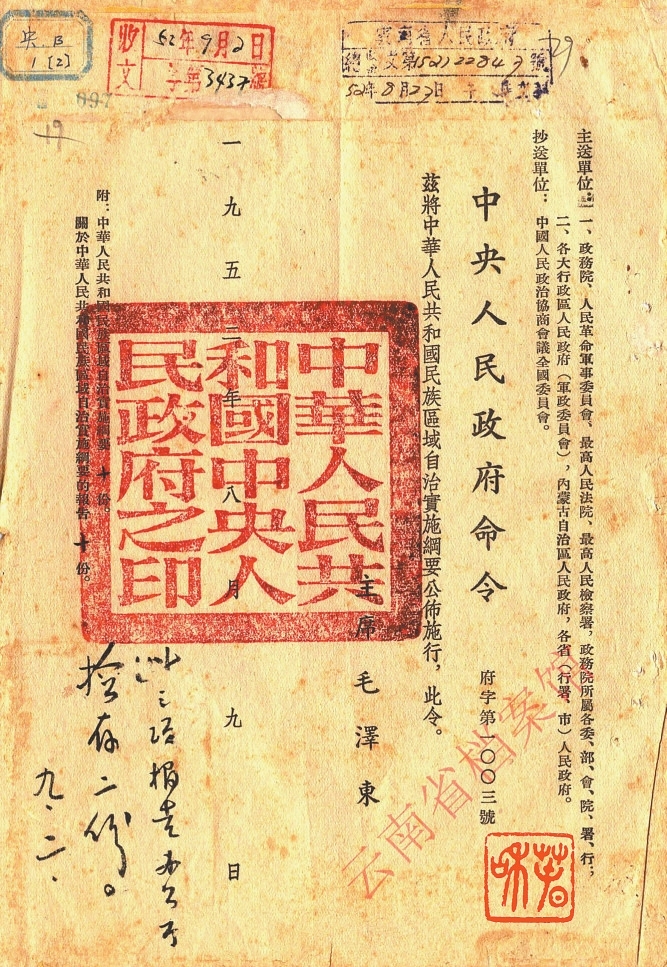 1952年8月9日,毛泽东主席签署中央人民政府关于公布实施《中华人民共和国民族区域自治实施纲要》的命令