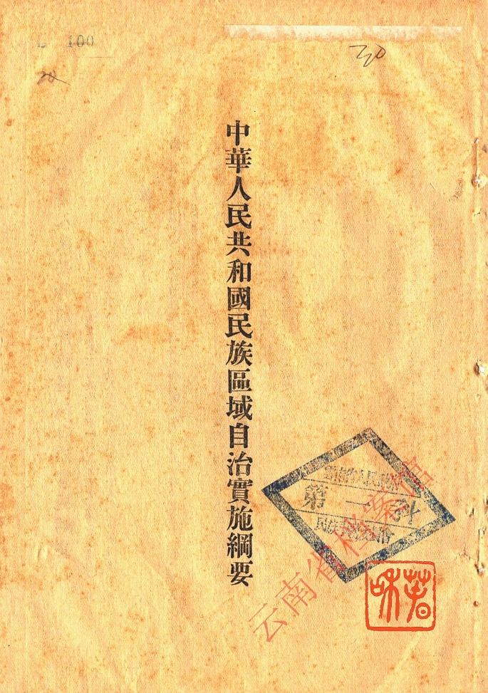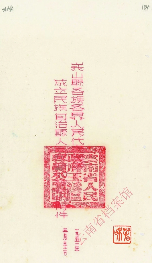 1951年5月31日,峨山县各族各界人民代表会议成立民族自治县人民政府的总结的附件(封面)