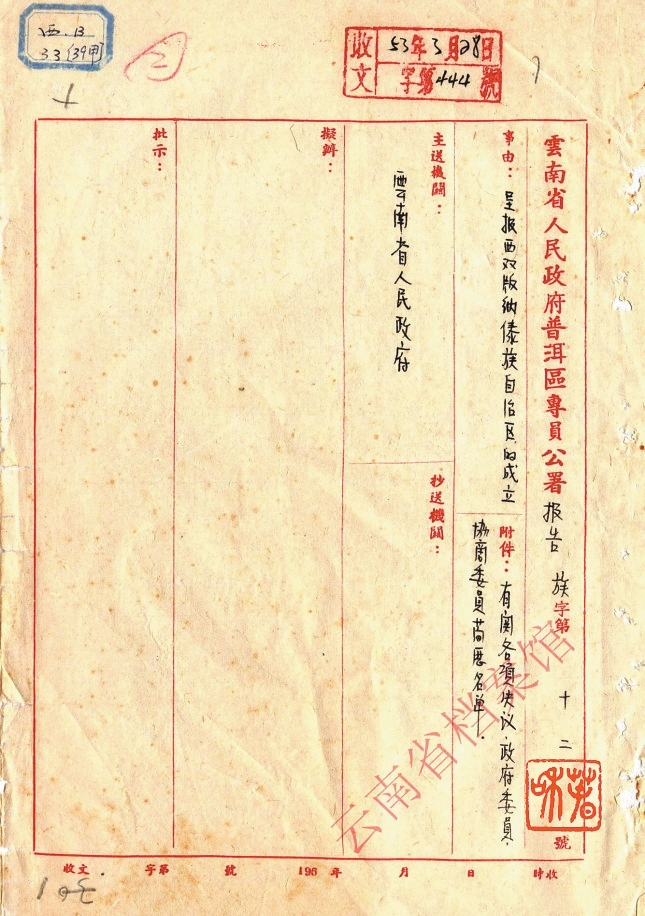 1953年3月6日,普洱区专员公署关于西双版纳傣族自治区成立,给云南省人民政府的报告