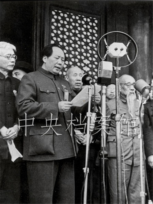 毛泽东在开国大典上宣读《中华人民共和国中央人民政府公告》。