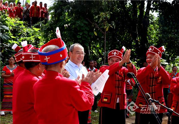 这是载入阿佤山历史的时刻,佤族群众身着节日盛装,载歌载舞,阿佤山成为一片欢乐的海洋。阮成发郑重宣读了习近平总书记的回信。宣读完毕,现场群众齐声欢呼,老支书代表岩翁和班洪村党支部书记赛茸激动地表达了心声,佤族青年击响木鼓,男女老幼唱起《阿佤人民唱新歌》,抒发佤族群众心向党、心向国家的真挚感情,感谢总书记、感恩党中央的共同心声。